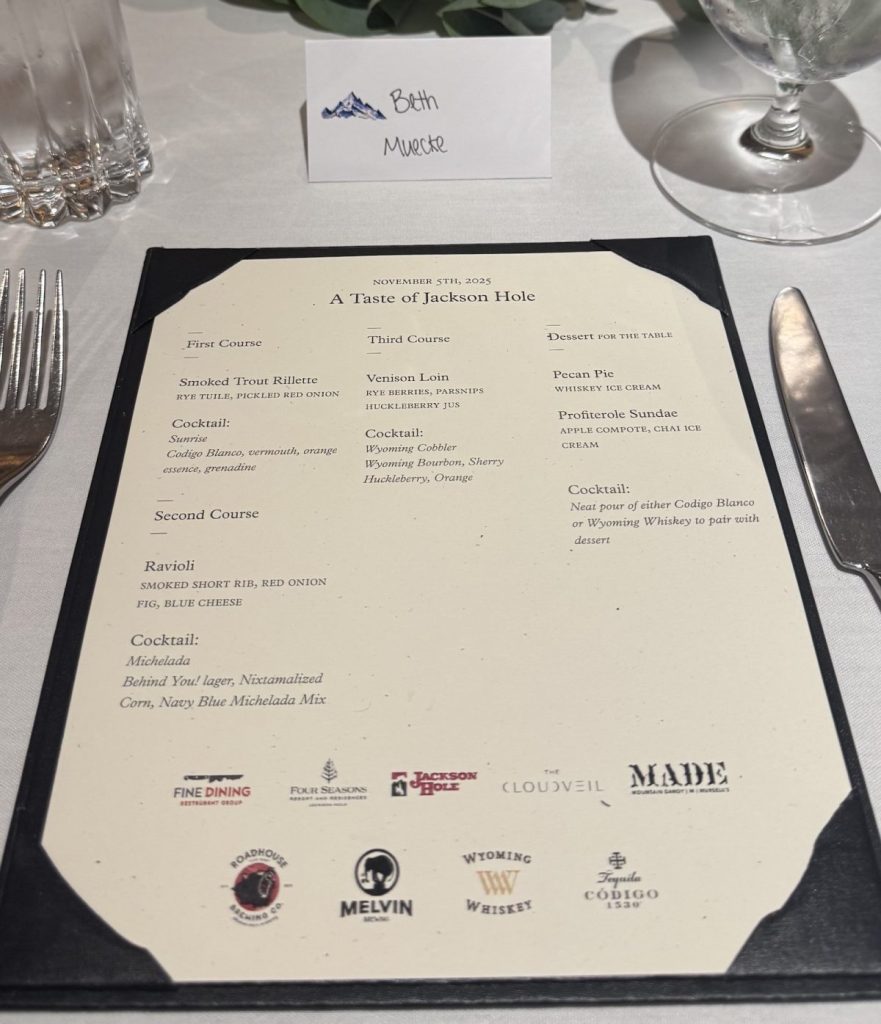 A special dinner was held celebrating the best of Wyoming and the Mountain West. Guests enjoyed Jackson Hole’s flavors and offerings guided by representatives from Fine Dining Restaurant Group, Jackson Hole Mountain Resort and The Cloudveil and Four Seasons luxury hotels. Specialty drinks were offered by Wyoming Whiskey, Codigo Tequila, Roadhouse Brewing Co. and Melvin Brewing. Congratulations to Chef Aaron Bludorn for an amazing dinner including